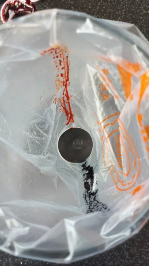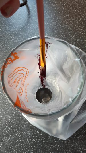 - Using an 1/2 in round Piping nozzle ( I believe you can just cut a freezer bag corner off but never tired it ) Paint your piping bags as required see pictures below to see how
