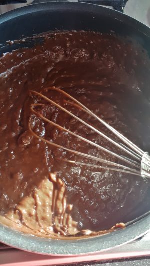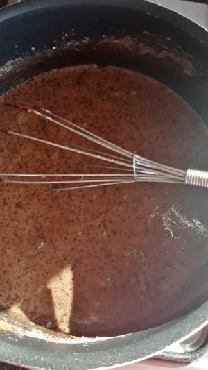 - Combine the flour, sugar, milk and cocoa in a pan and whisk until combined