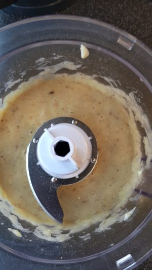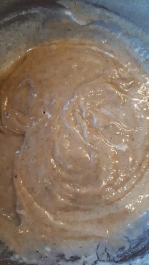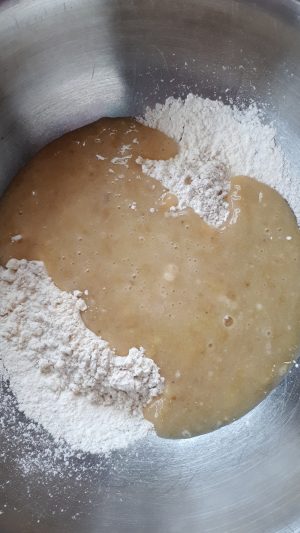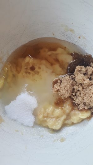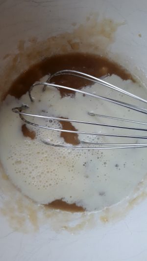 - Tip the banana mush, two sugars, milk concoction , vanilla and oil and into a mixing bowl and whisk until combined