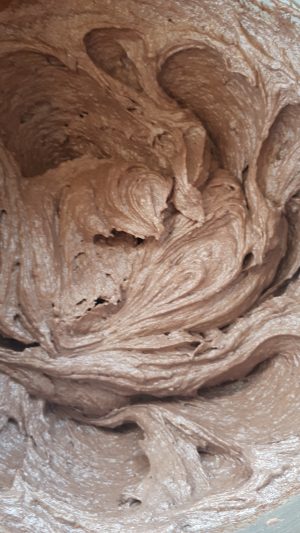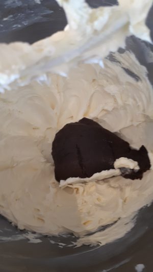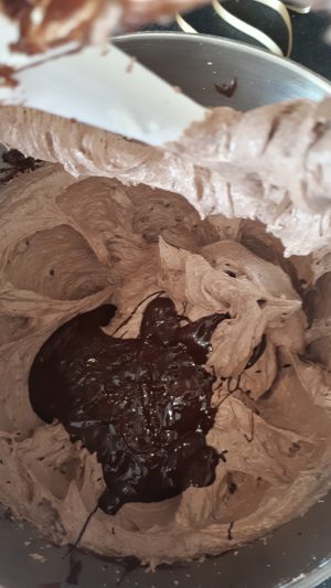 - Add the melted chocolate to the frosting and mix on high for 3 minutes until combined and light and airy