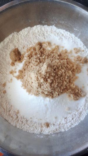 - Add the Caster Sugar / Superfine , Brown Sugar , Cinnamon and nutmeg to the Flour and Mix again