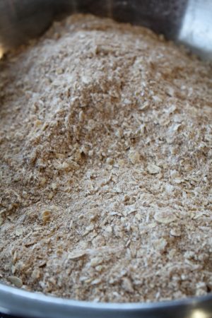 - Add the sugar and the oats to the flour mix and mix it with your hands rubbing the dry ingredients together to remove any stubborn sugar lumps until its all uniform and …… erm well mixed