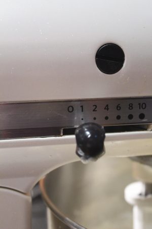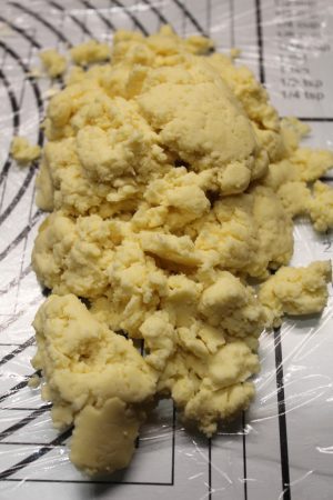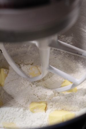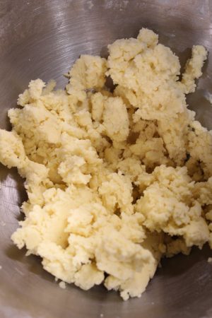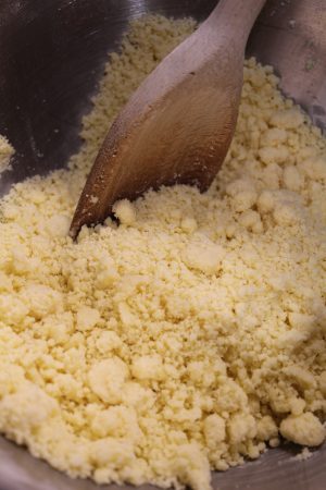 3. Place mix in stand mixer ON LOW setting until it looks like breadcrumbs as shown in the picture . Stir with a spoon or spatula to break any large clumps at the bottom of the bowl