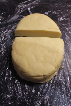 10. Take out of fridge unwrap and place onto a lightly floured piece of parchment , cut into 2/3rd , take a piece of cling film and place over the top ready to roll the dough