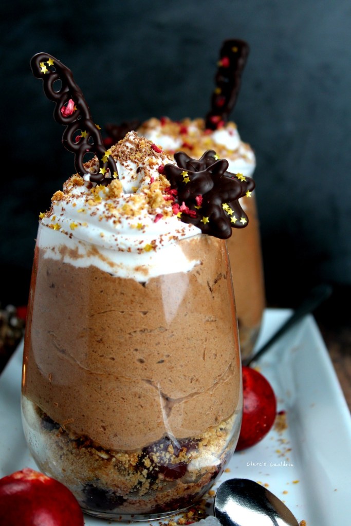 - Place the chocolate mush on top of the cherries and biscuit, with a spoon and put into freezer for 30 minutes