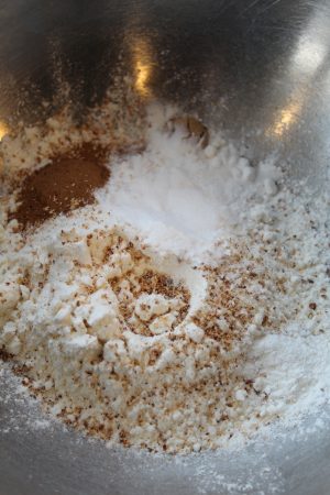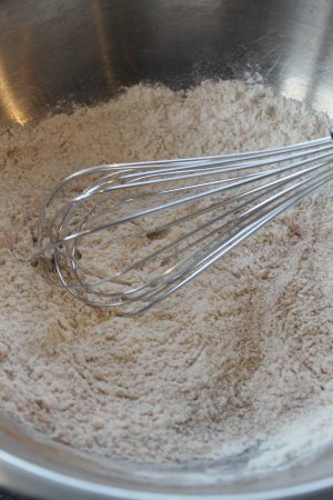 - Mix the Flour, baking powder , Xanthan if using , Cinnamon, Ginger and Nutmeg with a whisk in a medium sized bowl until fully mixed
