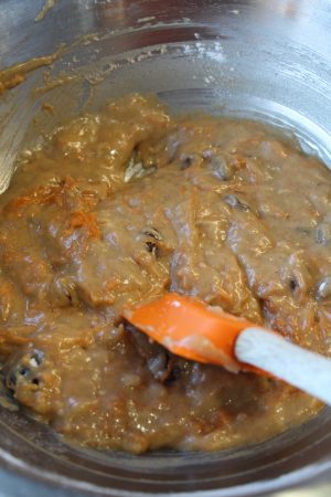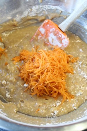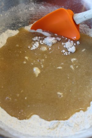- Add the wet to the dry ingredients and with a spatula fold in until combined