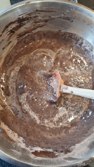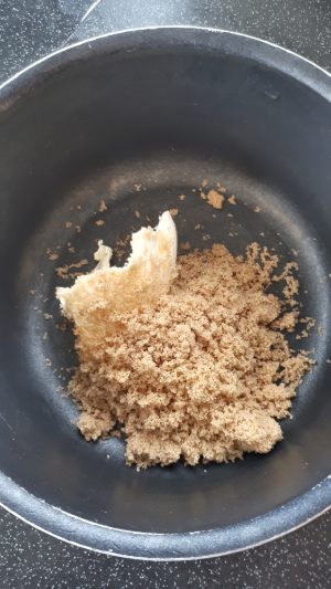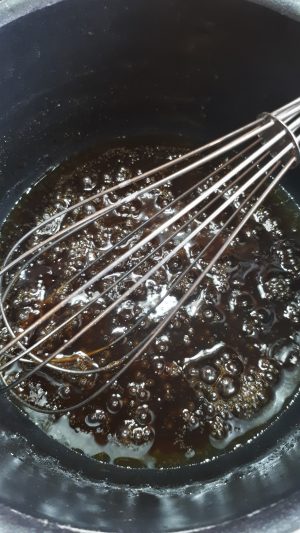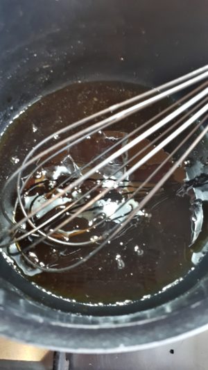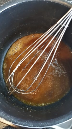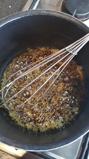 - In a small pan add 50 g Vegan Butter and 50 g of soft brown sugar and bring to the simmer on low …SIMMER !!!!! Stirring continually it will become more amalgamated , remember to use something metal !!! I know someone who melted a rubber spatula once 🙈