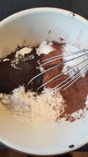 - In a bowl measure out the the Gluten free flour blend, add the cocoas , xanthan gum ( if using ) bicarb and baking powder