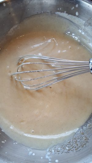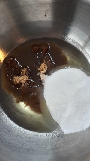 - In a separate bowl, add the oil and sugars and whisk until combined