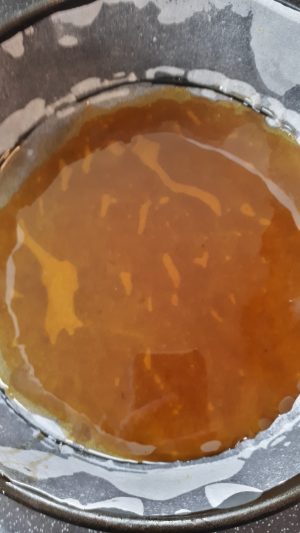- Pour into the bottom of the prepared baking tin, be careful its hot !!!
