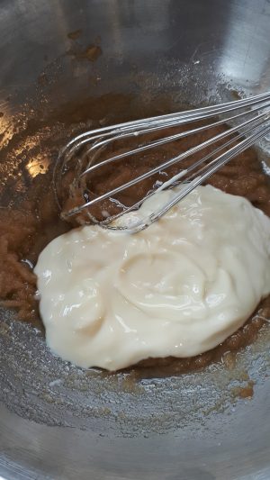 - Then add third the flour dry mix to the yogurt/ oil mix and fold in until nearly combined