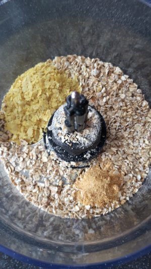 - In a food processor add a further 150 g of steel cut oats, nutrional yeast and onion powder and pulse 8 times ish until it looks like below , some fine bits some medium …….miss this step if you are using porridge oats