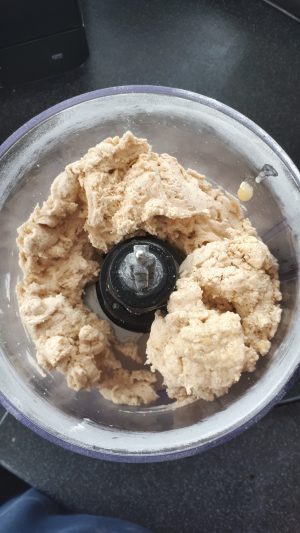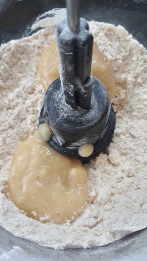 9. Add the banana mixture 2 tablespoon at a time pulsing once in between each addition, this will be repeated until all banana mixture is used up