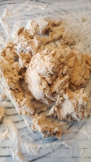 10. When soft dough forms tip onto a floured work surface, your dough should be slighlty sticky