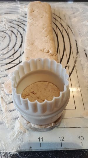 11. With LIGHTLY floured hands pull the dough together GENTLY until you can form a long rectangle the width of your 5cm (2in ) cutter and 2cm (3/4in for you old fashioned type 😂😂)in height . You will get 5 or 6 out of this process