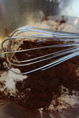 3. Measure ot the flour. cocoa powder, bicarb and xanthan gum into a medium bowl and whisk together with a whisk