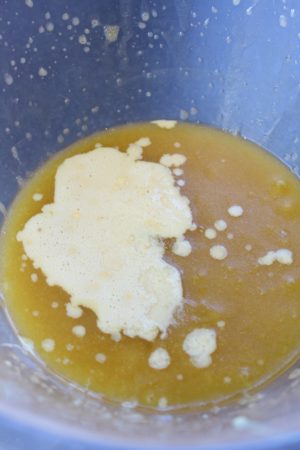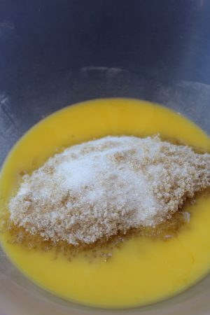 7. Add the granulated and sugar to the melt butter and with a hand mixer or whisk whisk until sugars are