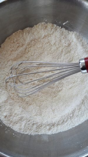 3. In a bowl whisk together the flour , xanthan gum ( if using ) bi carb and baking powder add the groung almonds and set aside