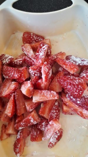 4. Clean hull and cut the strawberries into 1/4ers place in a small bowl ,sprinkle over a tbsp of gluten free flour blend and toss til covered, set aside