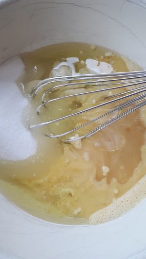 7. In a medium sized bowl add the oil, sugar, aquafaba sugar and chickpea flour blend in a bowl until combined with a whisk