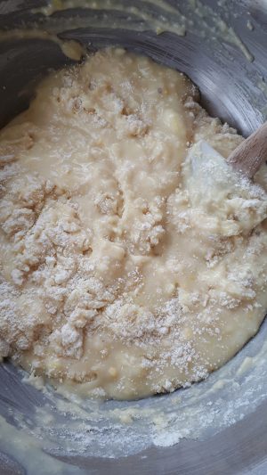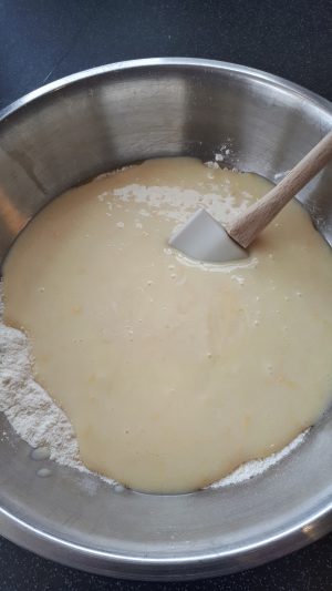 8. Add the wet ingredients to the flour / almond mix and with a a spatula until NEARLY combined