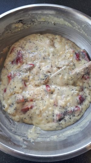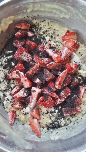 9. Add the strawberries and the Poppy seeds and continue to mix until all is mixed together