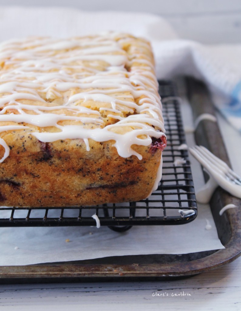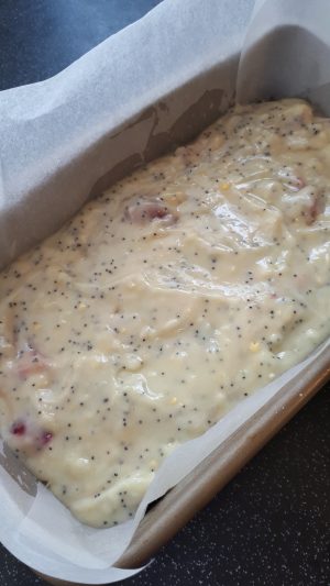 Cake is baked in a 2lb Loaf tin (8′ x 4′ x 3′ / 21cm x 11cm x 7cm ) Fresh berries only to be used in this bake…..not suitable for frozen. Poppy seeds can be omitted if you require