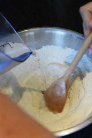 5. Start to add half the warm water and mix with a wooden spoon