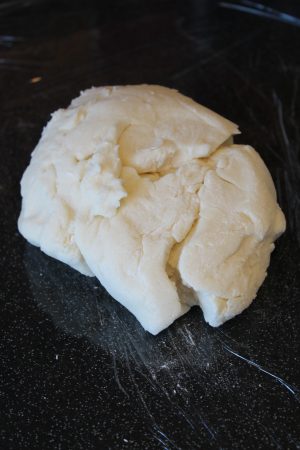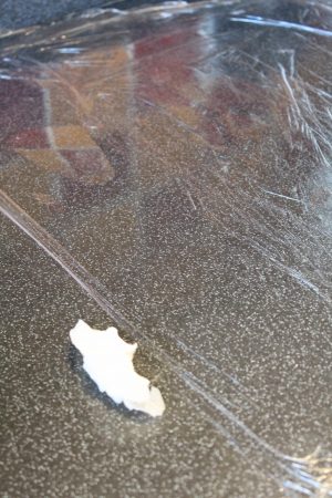 8. Dampen your work surface with a cloth and line with clingfilm ( it means you don’t add as much flour and fat easier to clean up )