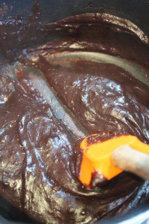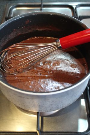 - Once boiling using a spatula continue to stir the pudding round the sides and the bottom using a folding motion.