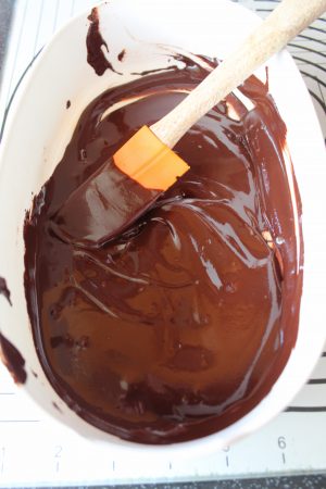 - Melt the chocolate chips in the microwave in 10 second bursts or in a basin over simmering water until melted, set aside to cool
