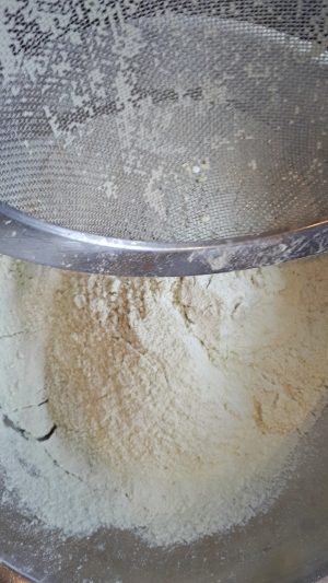 6. Sieve the dry ingredients into a large bowl including the Matcha