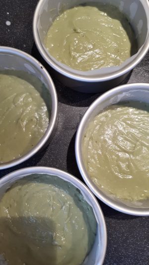 13. Place even amounts of the batter into each pan ( I find this easiest to weigh each one as my pans are the same weight )