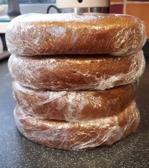 18. If fully decorating I advise to wrap in cling film after this time and place in freezer for an minimum of one hour before trimming and stacking