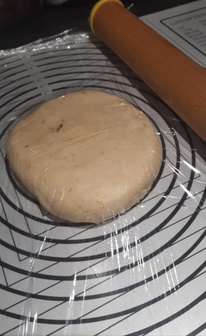 - Press the dough together, turn out onto some cling film and wrap in a disc