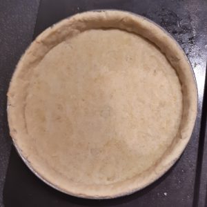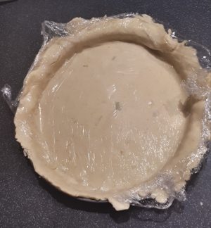 - Remove the top layer of clingfilm and flip the pastry over into the tin, CAREFULLY and remove clingfilm