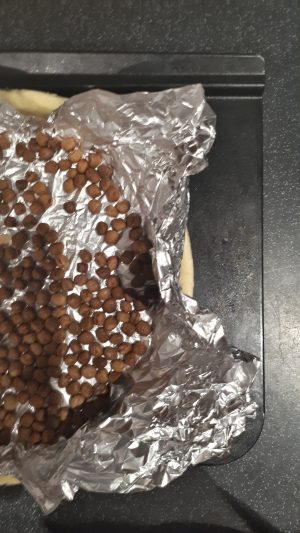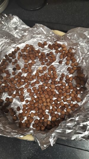 - Line the tart dough in the tin with foil and fill with baking beans or rice ( in my case dried peas I’ve used for years …..must get more I’ve lost some !!! )