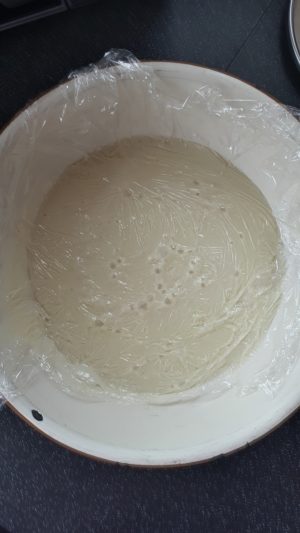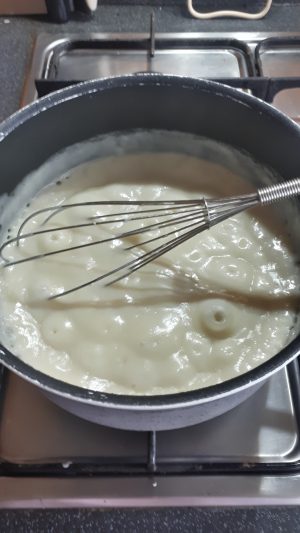 - Remove from heat and add the vegan butter ( Whisk in ……I FORGOT THE PIC !!!! ) ransfer into a bowl covered in clingfilm so it is touching the the surface to stop a skin forming