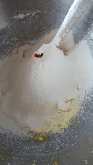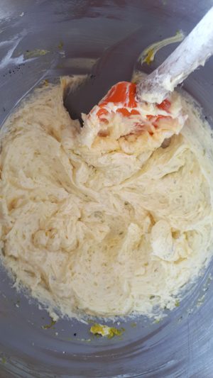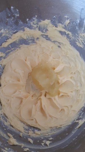 - With the mixer set to low, add the vanilla seeds and lemon zest and juice , mix again til just incorporated