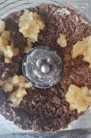 - Add the Apple Sauce and pulse until the mixtures comes together , in a large clump in the processor, it will be slighlty sticky