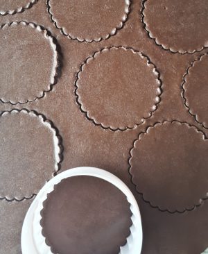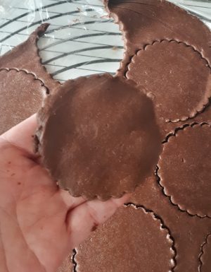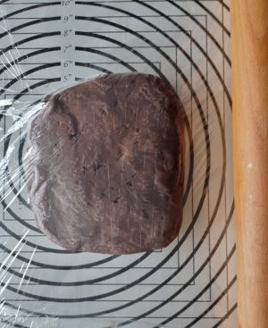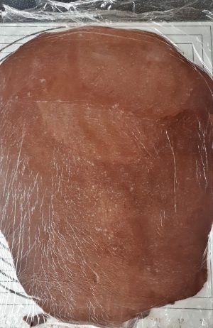 - Remove from fridge and roll out between 2 pieces of Clingfilm ( do not add flour it will stain the pastry )