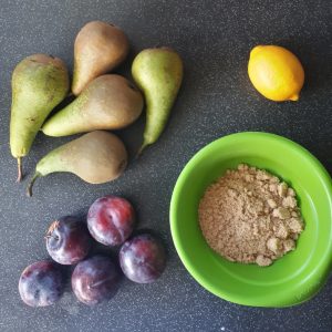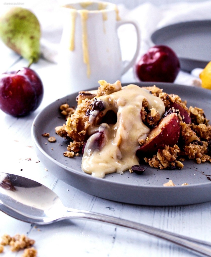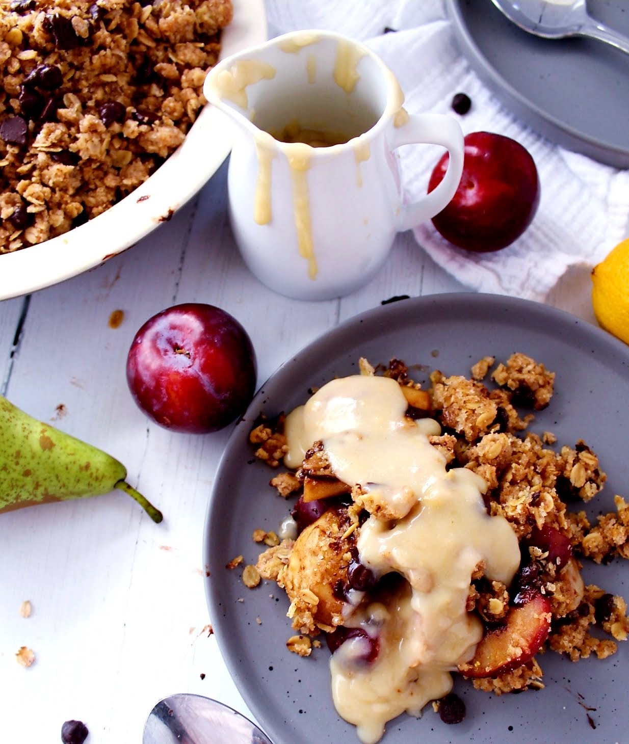Pear Plum and Chocolate Crumble with Vanilla Custard......... GF, DF V