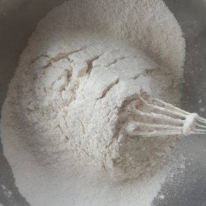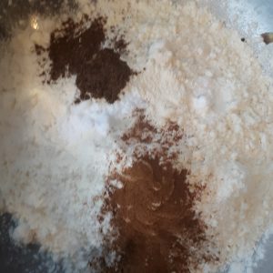 - Whisk and then Sift the flour, Bicarb, Cream of Tartar ,xanthan gum, Cinnamon and mixed spice into a bowl