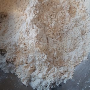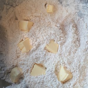 - Add small lumps of vegan butter to the flour mix, push them just under the surface and using your finger tips rub the fat in until it resembles breadcrumbs