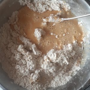 - Add half the the Milk mixture to the flour and with a metal spoon pull the flour from the outside to the inside on the centre of the bowl until it is combined