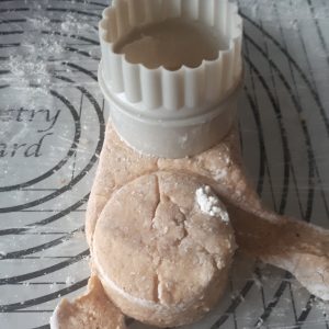 - With LIGHTLY floured hands pull the dough together GENTLY until you can form a long rectangle the width of your 5cm (2in ) cutter and 3cm (3/4in for you old fashioned type šš)in height and 27 cm long . You will get 5 out of this process