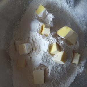 - Add small lumps of vegan butter to the flour mix, push them just under the surface and using your finger tips rub the fat in until it resembles breadcrumbs