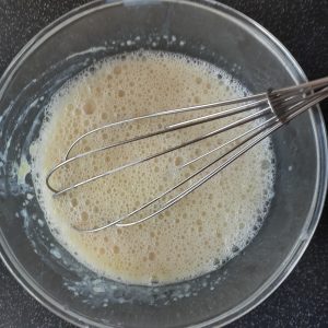 - Whisk the Milk Apple sauce, Agave Syrup ( and Honey Flavouring if using ) and Aquafaba in a jug until slightly frothy