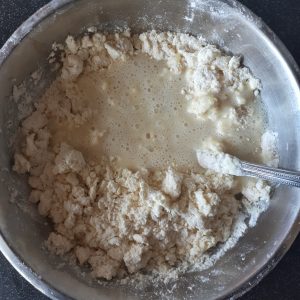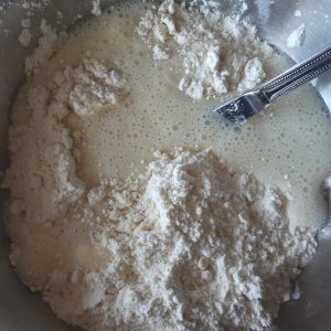 - Add half the the Milk mixture to the flour and with a metal knife pull the flour from the outside to the inside on the centre of the bowl until it is combined